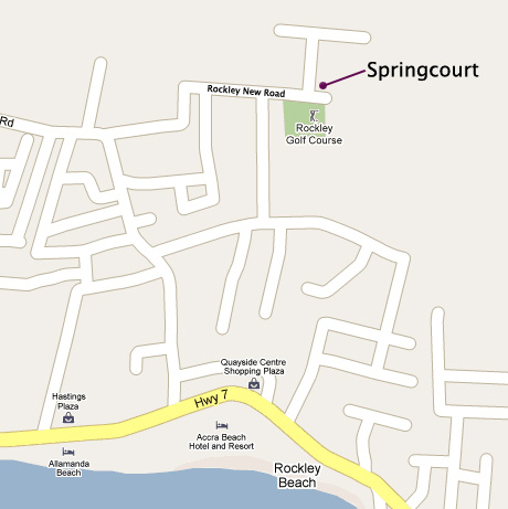 7 Springcourt is at the end of a delightful tree lined residential cul-de-sac overlooking Rockley Golf Course. Accra (Rockley) beach is a 5 minute drive or a 25 minute walk away and there are many restaurants and bars within easy reach to suit all tastes and budgets, including those in St Lawrence Gap which is a ten minute drive away. The property features well kept tropical gardens and a large communal swimming pool with plunge pool.